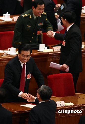 3月10日,中國國家主席胡錦濤在第十一屆全國人民代表大會第二次會議第三次全體會議結(jié)束后和代表握手。中新社發(fā) 杜洋 攝