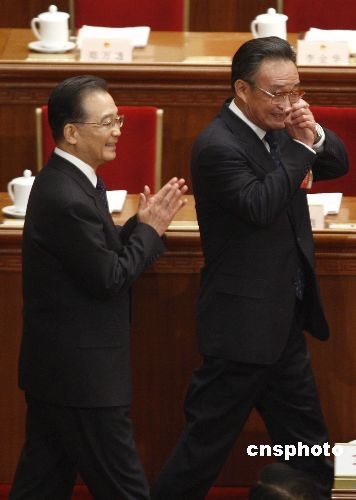 3月10日,十一屆全國人大二次會(huì)議舉行第三次全體會(huì)議,最高人民法院院長王勝俊、最高人民檢察院檢察長曹建明分別作工作報(bào)告。圖為吳邦國、溫家寶步入會(huì)場時(shí)向人大代表們致意。中新社發(fā) 盛佳鵬 攝