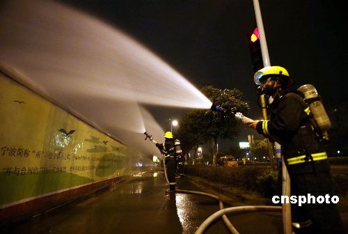 圖為消防官兵沿途對工地進(jìn)行稀釋。中新社發(fā) 袁帆 攝
