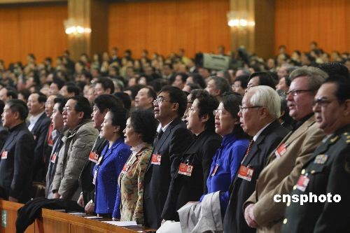 3月12日,全國政協(xié)十一屆二次會議舉行閉幕大會,全體委員在閉幕式上唱國歌。中新社發(fā) 盛佳鵬 攝