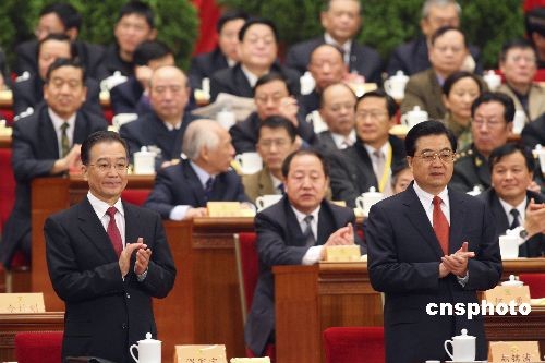 3月12日,全國政協(xié)十一屆二次會(huì)議舉行閉幕大會(huì)。國家主席胡錦濤、國務(wù)院總理溫家寶為通過政治決議鼓掌。中新社發(fā) 盛佳鵬 攝
