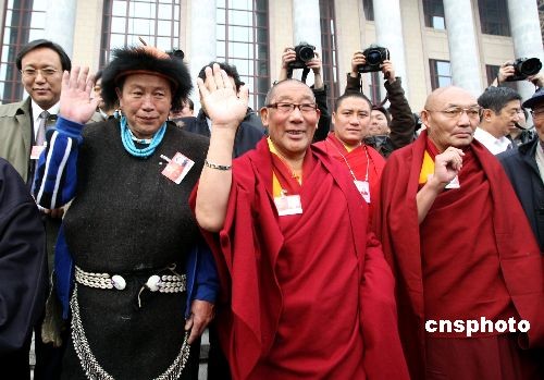 3月12日,全國政協(xié)十一屆二次會議閉幕。圖為來自西藏的宗教界委員阿旺吉卓(中)走出會場。中新社發(fā) 傅丹丹 攝