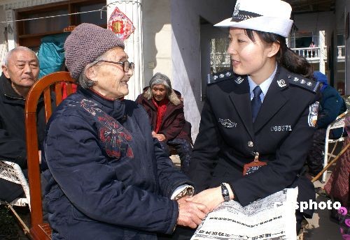 為傳達貫徹全國“兩會”精神,3月10日,河南商丘公安局交警支隊一大隊的警花們帶著宣傳資料來到轄區(qū)第一老年公寓,以多種形式向老人宣傳全國“兩會”精神。圖為警花和老人在聊天。中新社發(fā) 白項林 攝
