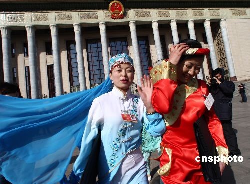 3月13日,第十一屆全國人民代表大會(huì)第二次會(huì)議在人民大會(huì)堂閉幕,少數(shù)民族代表在盎然的春風(fēng)中步出人民大會(huì)堂。中新社發(fā) 杜洋 攝