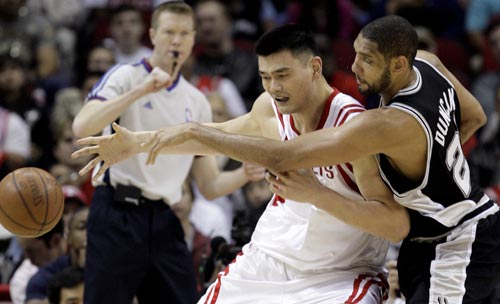 3月15日早上進(jìn)行的一場(chǎng)NBA常規(guī)賽中,昨天擊敗了山貓的火箭沒有能夠取得連勝。面對(duì)西南賽區(qū)的第一名圣安東尼奧馬刺,姚明拿到了18分11個(gè)籃板球,鄧肯拿到了15分12個(gè)籃板;鸺詈箨P(guān)頭連續(xù)錯(cuò)失反超和扳平拖入加時(shí)的機(jī)會(huì),最終以85比88遺憾的輸給了馬刺。