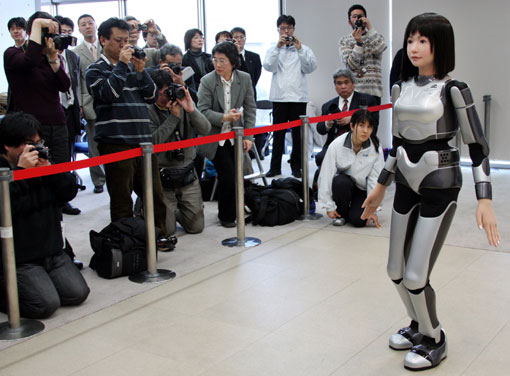 日本科學(xué)家最近展示了一名機(jī)械黑發(fā)美女,她不僅能說(shuō)話,可行走具有豐富的表情,還能在舞臺(tái)上走貓步。這個(gè)外表亮麗的類(lèi)人機(jī)器人名為“HRP-4C”,它的體內(nèi)裝有30個(gè)發(fā)動(dòng)機(jī),能夠幫助它行走和移動(dòng)手臂,面部的8個(gè)發(fā)動(dòng)機(jī)則賦予它憤怒、驚訝等表情。