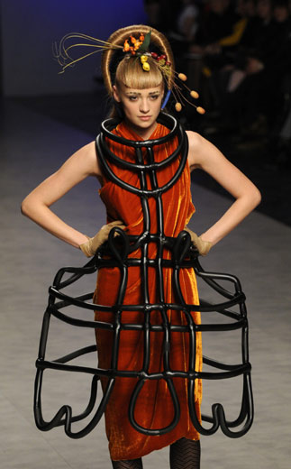 3月16日,模特在烏克蘭首都基輔舉行的時裝周上展示造型奇麗的發(fā)型設(shè)計。