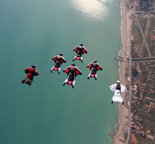中新網(wǎng)3月21日電,據(jù)英國媒體報(bào)道,一幫飛行愛好者近日在德國進(jìn)行了精彩的翼服飛行編隊(duì)表演,他們從距地面近4000米的飛機(jī)上跳下,以193公里的時(shí)速滑行,彼此之間只有幾厘米的間隔。這些勇敢者只戴著頭盔,穿著價(jià)值1000英鎊的翼服,他們的腳踝處還綁著發(fā)煙罐。在空中,他們就像一群紅色的蝙蝠。不僅完成了完美的空中編隊(duì),還像飛機(jī)一樣在身后留下一串煙霧。在距地面914米時(shí),翼服飛行愛好者們打開降落傘,降落至地面上。