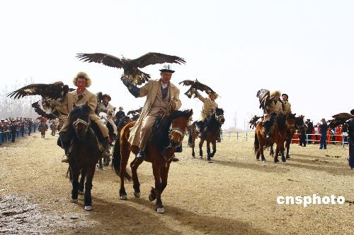 3月20日,新疆阿合奇縣舉辦第二屆獵鷹節(jié),當(dāng)?shù)乜聽柨俗巫迕癖娋奂谠摽h賽馬場(chǎng),展示自家馴養(yǎng)的獵鷹。新疆阿合奇縣的柯爾克孜族人馴養(yǎng)獵鷹有著悠久的歷史,至今,當(dāng)?shù)啬撩袢酝暾A糁嫉鸟Z養(yǎng)方式,被譽(yù)為中國(guó)“獵鷹之鄉(xiāng)”。柯爾克孜族人在放牧的同時(shí),經(jīng)常騎馬到高達(dá)近百米的高山頂上,將自己馴養(yǎng)的獵鷹放飛,因此當(dāng)?shù)乜聽柨俗巫逡脖蛔u(yù)為“鷹王”。 中新社發(fā) 馬衛(wèi)平 攝