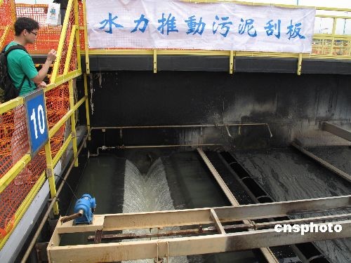 香港特區(qū)政府渠務(wù)署在迎來成立二十周年之際,于二零零九年三月二十一日向市民開放昂船洲污水處理廠,展示污水凈化處理過程,介紹和體驗(yàn)港府正斥巨資推行的凈化海港計(jì)劃。圖為市民觀看污水進(jìn)入沉淀池后,水力推動(dòng)的污泥刮板在水面上層刮起一層層黑臭污垢的過程。 中新社發(fā) 余瑞冬 攝