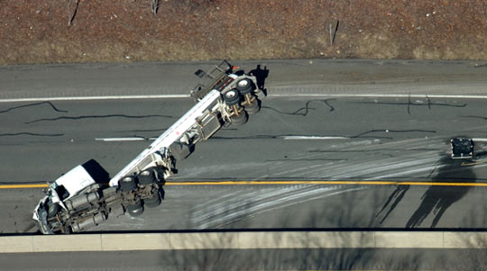 圖:美國一運載有害化學(xué)物卡車在公路翻車(2)