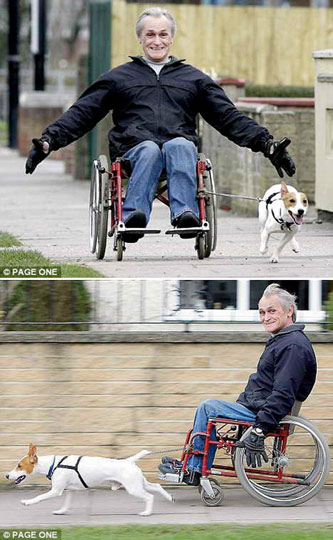 英殘疾者訓(xùn)練狗拉輪椅。據(jù)英國(guó)《每日郵報(bào)》報(bào)道,一只3歲大的杰克羅素梗每天為其殘疾主人拉輪椅,它已成為主人輪椅的小型發(fā)動(dòng)機(jī)。除非遇到車(chē)輛、貓和令其感興趣的氣味,否則它不會(huì)停下來(lái)。這只名叫科迪的杰克羅素梗套著特制的挽具,每天都拉著其主人艾倫-史密斯在諾丁漢郡克利夫頓外出兜風(fēng)。57歲的史密斯稱(chēng),他的這只寵物犬拉輪椅的時(shí)速可達(dá)24公里。史密斯因幼時(shí)患小兒麻痹癥而殘疾,不得不坐輪椅,史密斯49歲的妻子多娜一直負(fù)責(zé)照顧他。史密斯說(shuō):“科迪會(huì)在道路交叉處停下來(lái),看看是否有車(chē)輛。它的唯一缺點(diǎn)是,如果看到了一只貓或者另一只狗,它會(huì)停下來(lái),像老虎那樣臥著。它的肌肉很強(qiáng)健,獸醫(yī)說(shuō),它非常健康!笔访芩狗Q(chēng),令人感到奇怪的是,科迪只吃超市出售的一種品牌為“英雄”的狗糧。他說(shuō):“它不吃其它食物,我們?cè)嚵怂衅渌澄!?table border=0 cellspacing=0 cellpadding=0 align=left>