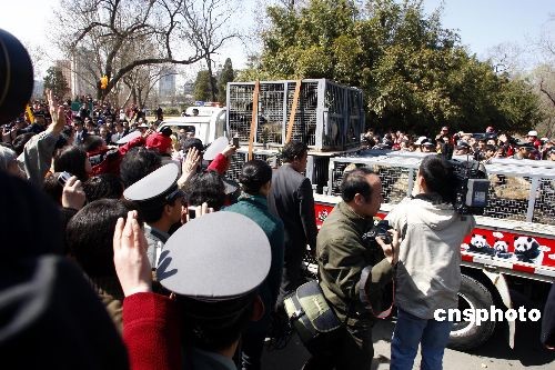 3月22日,在京生活了9個月的8只奧運大熊貓開始起程返回四川老家,北京動物園特地舉辦了“奧運熊貓返川儀式”,吸引萬名觀眾前來依依惜別。中新社發(fā) 鄭雄增 攝