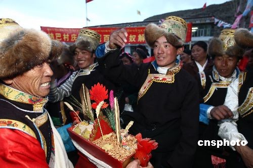 3月23日晚,西藏山南地區(qū)結(jié)巴鄉(xiāng)結(jié)巴村的村民自發(fā)組織篝火晚會(huì),跳起鍋莊舞喜迎西藏百萬(wàn)農(nóng)奴解放日。圖為村農(nóng)民互敬象征五谷豐登的“切瑪”。結(jié)巴鄉(xiāng)是西藏第一個(gè)“朗生互助組”的誕生地。西藏實(shí)行民主改革后,廣大農(nóng)奴獲得了解放,自己當(dāng)家做主,并擁有了土地。中新社發(fā) 杜洋 攝