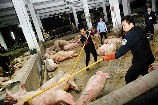 25日,天河區(qū)動防所透露,在天河牲畜交易市場來自河南新鄉(xiāng)孟津的149頭生豬中,已明確查出17頭含有“瘦肉精”。25日晚,動檢人員用高壓電擊將這149頭生豬電死后,送上衛(wèi)生處理車,運往廣州市衛(wèi)生處理廠作無公害處理。而天河牲畜市場43戶檔主,已集體寫好“不要關(guān)閉市場”的訴求書,擇日遞交到政府有關(guān)部門。