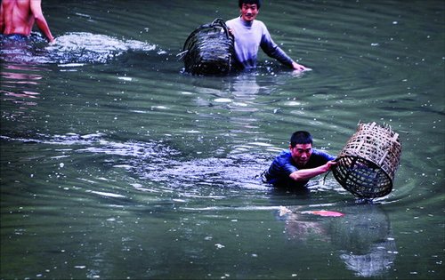 渾濁的池塘水中,無數(shù)福壽魚浮出水面,嘴巴奮力地一張一合。十來個(gè)壯年男子站在水中,有人穿著一身衣服,有人僅著底褲;有人拿著塑料袋、竹筐上陣,有人干脆赤手空拳,瞪大眼睛,在渾水中摸魚。他們的目標(biāo)不是探手可及、幾兩重的福壽魚,而是眾多沉在水底、動(dòng)輒幾斤甚至上十斤的大魚。水不深,但黑黑的淤泥幾乎沒過摸魚者的臀部,這令他們舉步維艱。(肖海坤)