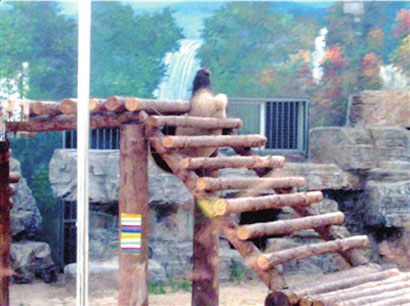 沒想到,正當游客們?yōu)椤氨焕А毙茇堉睍r,那只熊貓自己蕩了幾下,試圖抓住木梯的架子做支撐。嘗試了幾次后,熊貓突然用力一起身,抓住木架的平臺,從木梯縫隙中抽出肥碩的身體,順著欄桿爬了下來。胡先生說,整個過程不到5分鐘,“很可愛,沒想到它圓嘟嘟的卻挺靈活”。成功“自救”的大熊貓似乎驚魂未定,下了木架后就坐到石頭后“安神”。游客見到此情景,不禁啞然失笑,為它鳴掌鼓勵。