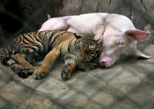 中新網(wǎng)4月9日電 據(jù)英國(guó)媒體報(bào)道,老虎和豬共享一籠的情景并不常見(jiàn),但是在泰國(guó)的一家老虎動(dòng)物園里,虎豬依偎在一起互哺的溫馨場(chǎng)面卻司空見(jiàn)慣。據(jù)稱,這家老虎園倡導(dǎo)混養(yǎng)的“歡樂(lè)家庭”模式,通常小老虎由母豬喂哺長(zhǎng)大,老虎長(zhǎng)大后又會(huì)哺育豬的幼崽。