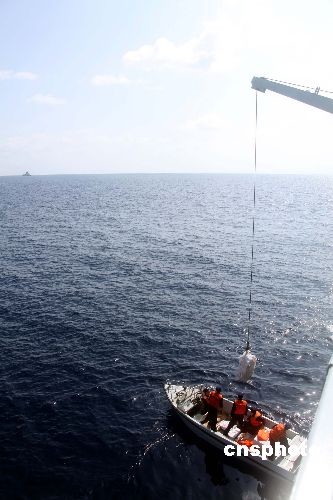 當(dāng)?shù)貢r(shí)間4月13日清晨6時(shí)許,中國(guó)海軍第一、第二批護(hù)航編隊(duì)順利會(huì)師亞丁灣。圖為兩批護(hù)航編隊(duì)會(huì)合后,“黃山”號(hào)導(dǎo)彈護(hù)衛(wèi)艦派快艇運(yùn)送一批肉類副食物資補(bǔ)給到“?凇碧(hào)導(dǎo)彈驅(qū)逐艦上。中新社發(fā) 孫自法 攝