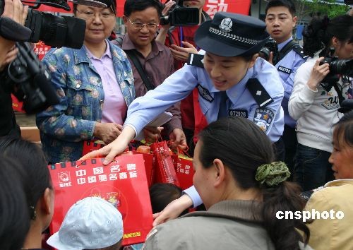 5月6日,臨近“5.12”一周年和母親節(jié)的日子,抗震英模蔣敏來到位于彭州市龍門山鎮(zhèn)東林寺板房區(qū),為那里的受災(zāi)民眾捐出自己用一個(gè)月的工資購買的彩虹電滅蚊器。彭州市龍門山鎮(zhèn)地處龍門山脈,北與汶川縣和德陽什邡接壤,該鎮(zhèn)的東林寺板房區(qū)現(xiàn)安置了九峰村461戶群眾,1600余人。去年“5.12”地震中,九峰村村民90%的住房垮塌或成為危房。中新社發(fā) 霍潺 攝