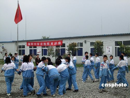5月8日,在距離都江堰市中心不遠的一所板房學(xué)校內(nèi),來自蒲陽中學(xué)的一群中學(xué)生正在歡樂嬉戲。大約一年前,他們在頃刻之間失去了學(xué)校和家園,臨時蓋起的簡易住房成了他們彌足珍惜的“樂園”,隨著都江堰各大學(xué)校援建工程的加緊建設(shè),這些孩子們下學(xué)期就有望搬入新學(xué)校,恢復(fù)震前正常的學(xué)習(xí)生活。中新社發(fā) 鄭瑩瑩 攝