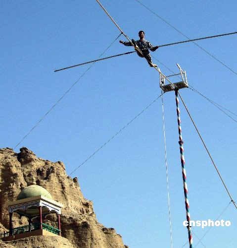 6月2日,新疆吐魯番著名的國家5A級風(fēng)景區(qū)葡萄溝上演了一場“達(dá)瓦孜”表演。演員在距離地面30多米的高空一根3厘米左右的鋼絲上時(shí)而健步如飛,時(shí)而倒掛,時(shí)而做各種高難度體操動作,令觀看的游客無不稱奇。達(dá)瓦孜是維吾爾族傳統(tǒng)民間雜技表演藝術(shù)之一,“達(dá)瓦孜”是新疆維吾爾語“高空走繩”的意思。中新社發(fā) 姜浩 攝