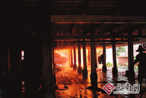 與此同時(shí),發(fā)現(xiàn)房屋起火的村民也跑到村寨辦公室,用高音喇叭通知村民趕來(lái)救火。等玉溫接到兒媳電話趕回來(lái)時(shí),大火已經(jīng)燒得通紅,現(xiàn)場(chǎng)趕來(lái)的數(shù)十名村民已經(jīng)開(kāi)始用臉盆和水桶接水救火了。隨后趕來(lái)的公安民警、以及從遠(yuǎn)處的曼春滿、曼聽(tīng)等村寨趕來(lái)的村民也紛紛加入到了救火隊(duì)伍中。
