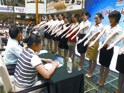 “請把劉海撥開”、“把小腿露出來”、“上前一步伸出雙手”、“請繞場一圈”……12日,“2009年中國亞運空姐招募大匯”武漢賽區(qū),面試全部結(jié)束,5位專業(yè)評委嚴(yán)格按照標(biāo)準(zhǔn)篩選,1022名佳麗僅有542人拿到通行證,晉級下一輪。
