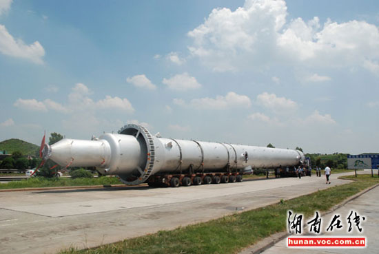 14日下午,一輛長大貨車,馱著161.58噸重的巨型“導(dǎo)彈”途徑京珠高速潭耒路段時,被耒陽高速交警查獲。經(jīng)測量,該車總長54米,其中所載“導(dǎo)彈”長47米,相當(dāng)于三節(jié)火車車皮那么長(單節(jié)火車車皮長18米),屬嚴(yán)重超限,且駕駛員無法提供有效的超限通行證件。
