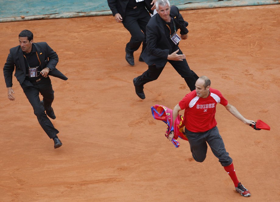 法網男單決賽場上,一位費天王的癡心球迷沖入球場,強行將自制的一頂帽子戴到費德勒的頭上。安保人員及時出現,將狂熱粉絲架出場外。