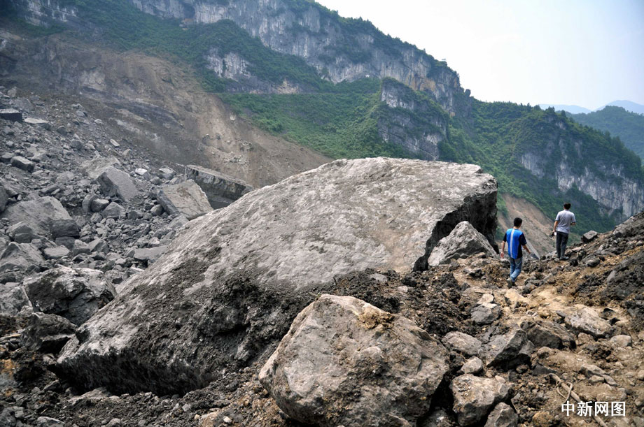 山谷谷底,從山體上垮塌而下的巨石隨處可見(jiàn),這一塊高達(dá)20余米巨石和其他土石將三聯(lián)采礦場(chǎng)的礦井口掩埋。 曹多然 攝