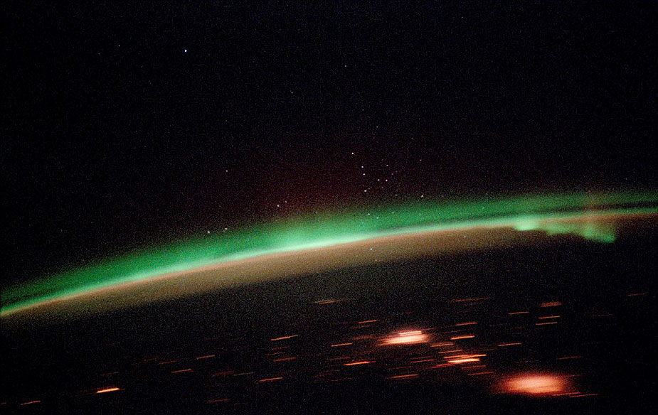 在兩極上空大氣層以上數(shù)十公里的太空,極光現(xiàn)象仍能被清楚地觀測(cè)到。紅色、綠色的極光閃爍著怪異的微弱綠光,好似鬼怪之光,給人以寒冷的感覺。在繞地軌道上的宇航員用長(zhǎng)曝光相機(jī)和35毫米膠片拍攝下了這些怪異的圖片。