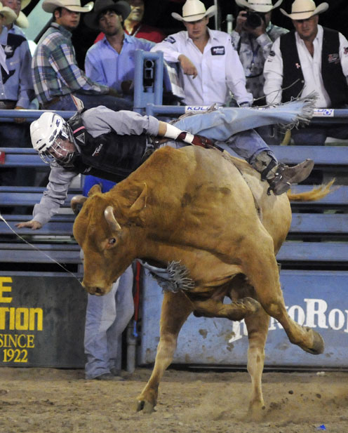 圖為6月24日在美國內(nèi)華達州舉行的騎牛大賽。