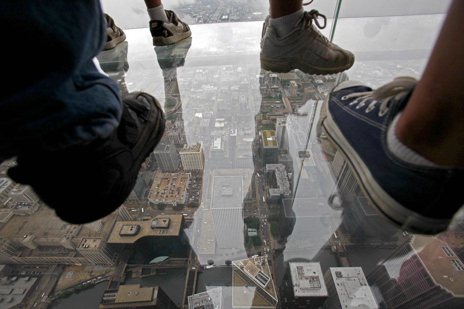 7月1日,美國芝加哥,西爾斯大廈在第103層瞭望臺增設(shè)的玻璃陽臺對媒體開放。這些玻璃陽臺建在大廈西側(cè),從瞭望臺向外延伸約1.2米。陽臺的玻璃地板厚達12.7厘米,可承重約5噸。