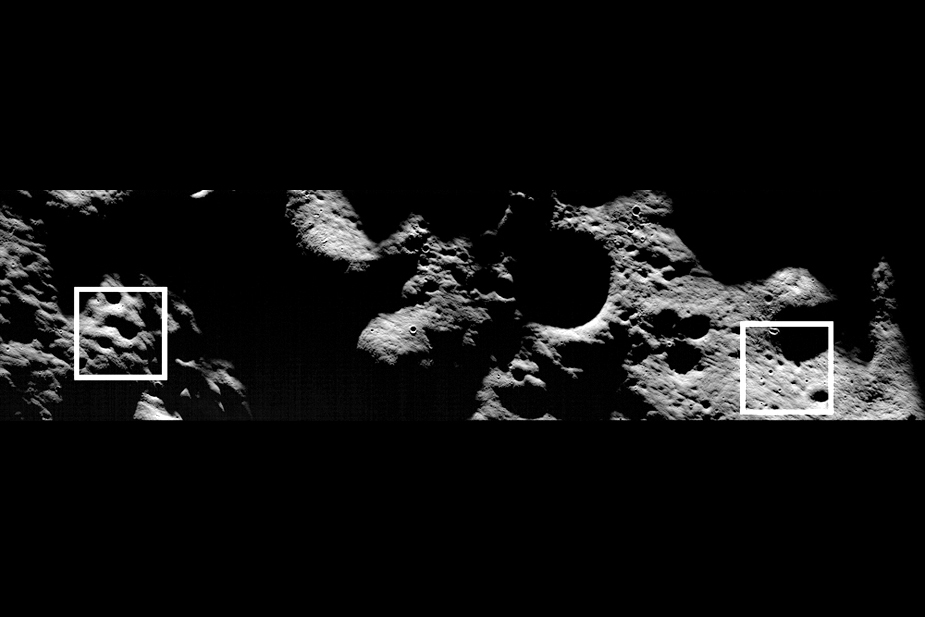 此圖顯示的是月球表面兩個位置的相互關系,圖片顯示的地區(qū)寬3542米,長14000米。