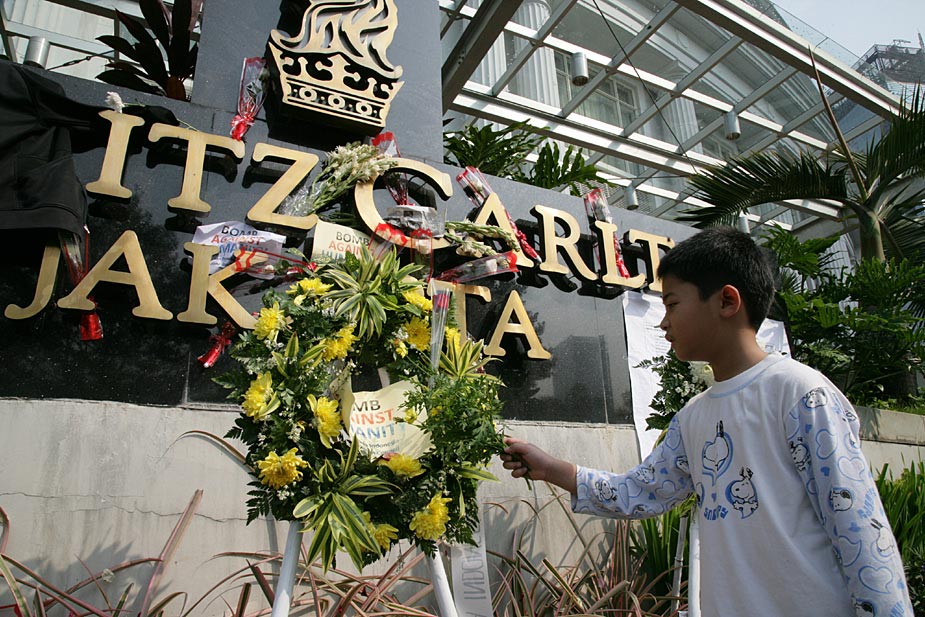 7月18日,印度尼西亞首都雅加達的民眾紛紛來到發(fā)生爆炸的萬豪酒店和麗嘉酒店,向死難者獻花表示哀悼。
