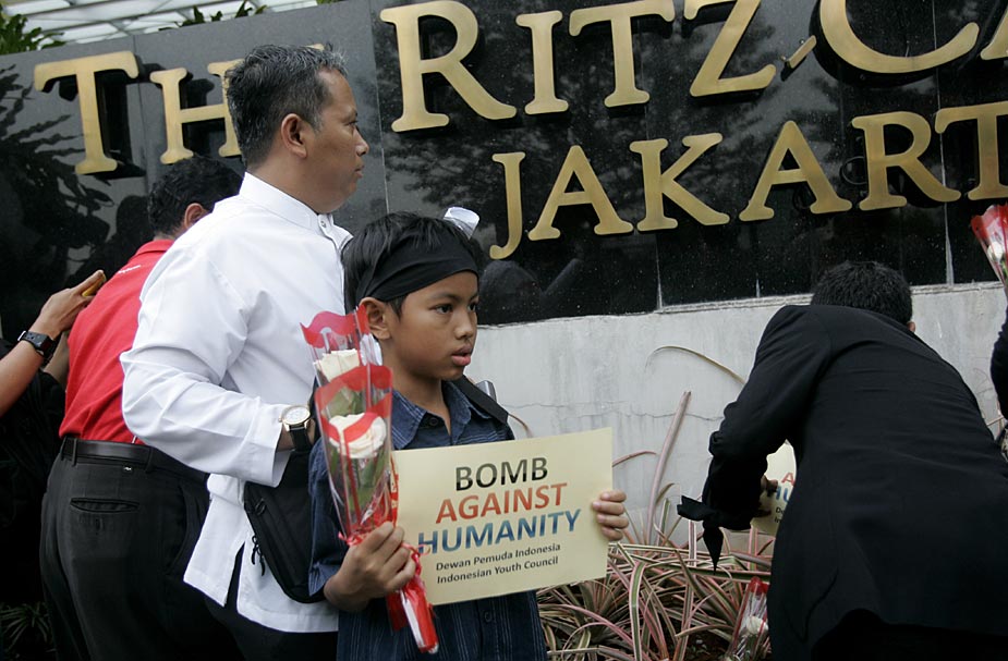 7月18日,印度尼西亞首都雅加達(dá)的民眾紛紛來(lái)到發(fā)生爆炸的萬(wàn)豪酒店和麗嘉酒店,向死難者獻(xiàn)花表示哀悼。