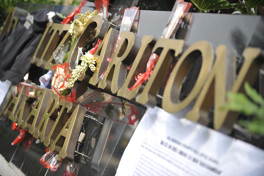 7月18日,印度尼西亞首都雅加達(dá)的民眾紛紛來到發(fā)生爆炸的萬豪酒店和麗嘉酒店,向死難者獻(xiàn)花表示哀悼。