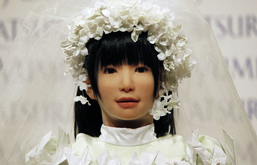 7月22日,日本大阪,類人機(jī)器人“HRP-4C”身穿由著名婚紗設(shè)計(jì)師為其量身定做的婚紗亮相。>>點(diǎn)擊觀看視頻