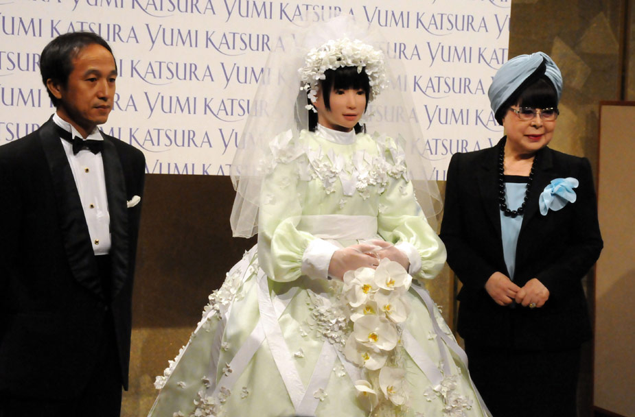 7月22日,日本大阪,類人機(jī)器人“HRP-4C”身穿由著名婚紗設(shè)計師為其量身定做的婚紗亮相。>>點擊觀看視頻