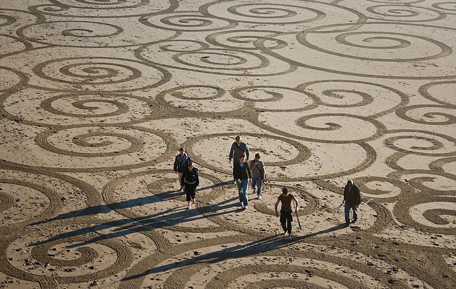 據(jù)英國媒體7月27日?qǐng)?bào)道,藝術(shù)家Andres Amador用耙子在沙灘上作畫,眾多中心對(duì)稱的幾何圖形,不在乎是否能長久保留,但求被海浪帶走前與大自然的完美融合。