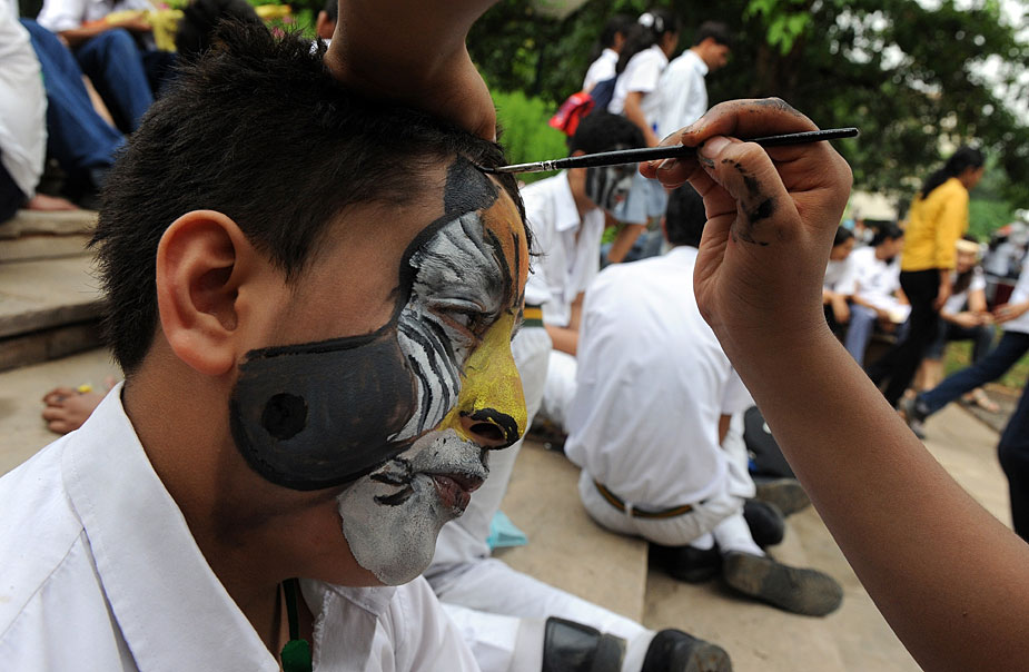 7月28日,約2000名學(xué)生在新德里化妝成老虎的臉譜,圍坐成老虎的造型,與官員和野生動物專家們一起呼吁人們保護(hù)孟加拉虎和其他野生動物。