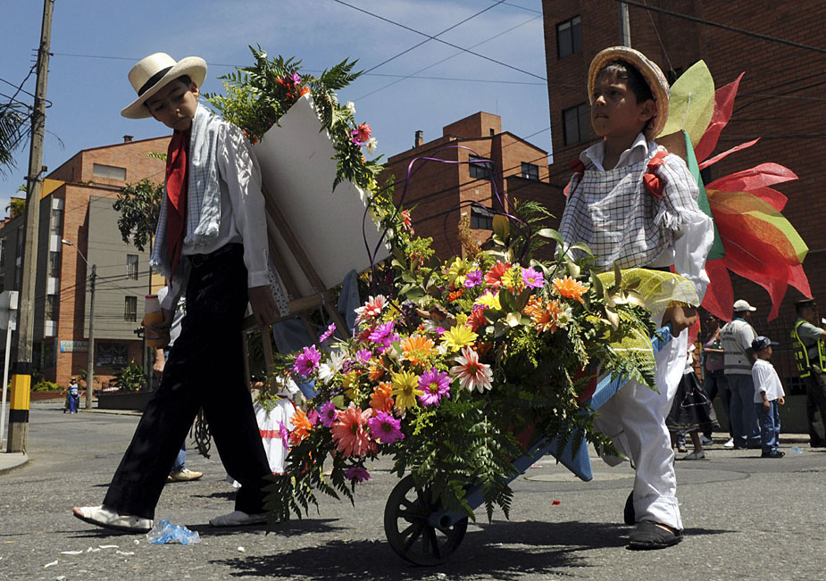 8月1日,在哥倫比亞麥德林,孩子們參加鮮花節(jié)游行。鮮花行業(yè)是哥倫比亞的主要產業(yè)之一。