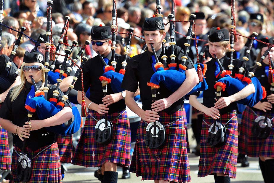 8月2日,蘇格蘭梅西爾風笛樂隊的藝術家們在洛里昂克爾特文化節(jié)上進行表演。