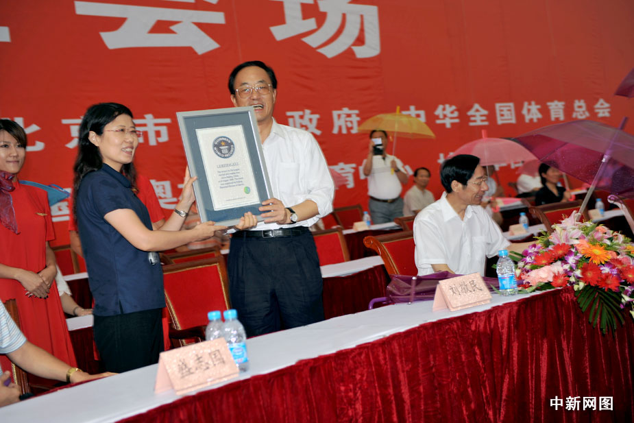 圖為世界吉尼斯總部認(rèn)證官將認(rèn)證書(shū)頒發(fā)給北京市副市長(zhǎng)劉敬民。