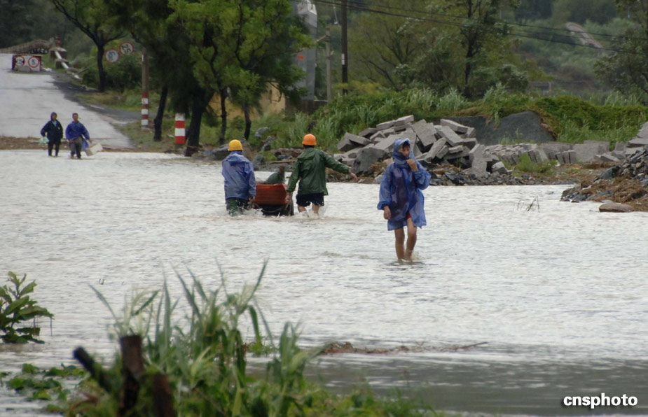 8月9日16時20分,第8號臺風“莫拉克”在福建省霞浦縣沿海登陸,登陸時臺風中心最大風速12級(33米/秒),中心氣壓970百帕!澳恕睅淼膹娊涤曛率垢=ㄏ计衷S多路段被淹。中新社發(fā) 王東明 攝