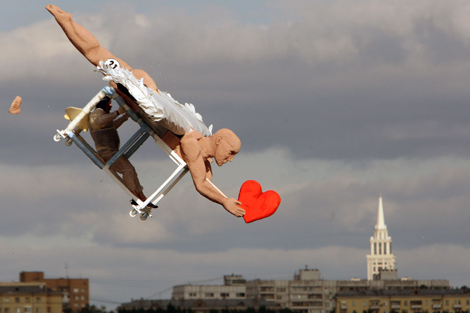 8月9日,莫斯科河畔舉辦一年一度的“墜落節(jié)”,表演者帶著自己設(shè)計制作的各種“飛行器”勇敢的從高空跳入水中。