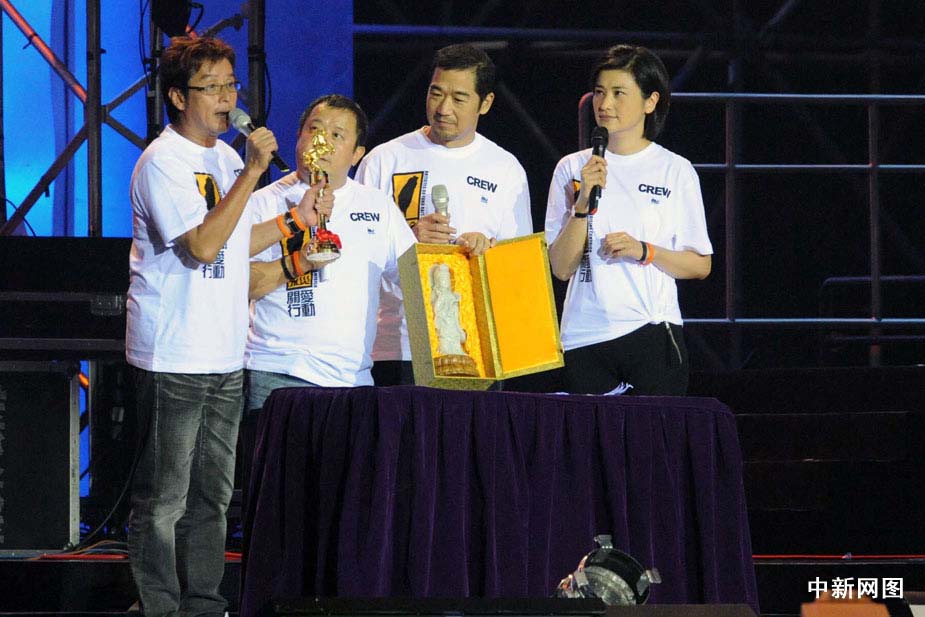 圖為譚詠麟現(xiàn)場(chǎng)捐出金馬獎(jiǎng)。