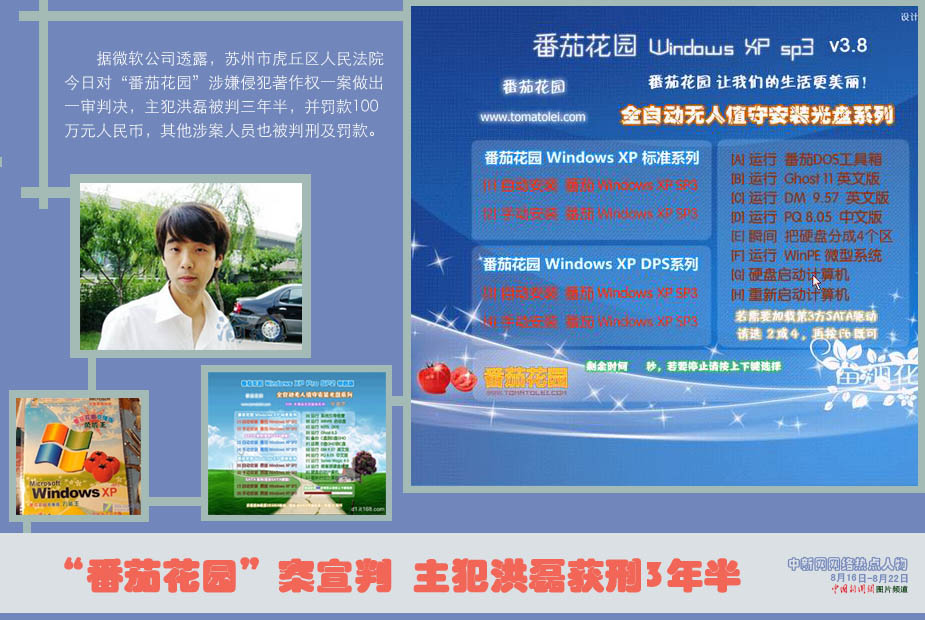 中新網(wǎng)本周熱點(diǎn)人物之——洪磊 微軟公司透露,蘇州市虎丘區(qū)人民法院今日對“番茄花園”涉嫌侵犯著作權(quán)一案做出一審判決,主犯洪磊被判三年半,并罰款100萬元人民幣,其他涉案人員也被判刑及罰款。