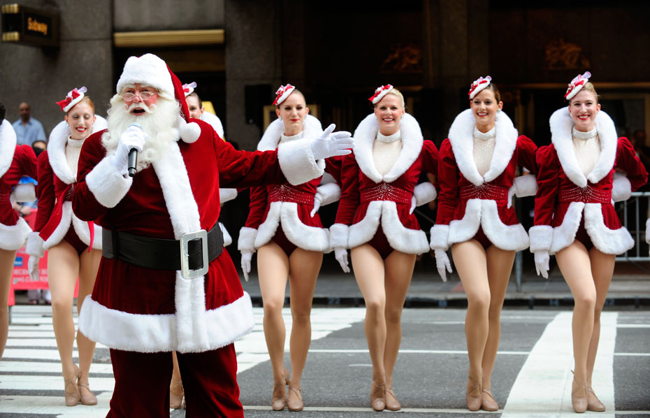 8月25日,美國“火箭女郎”舞蹈團身著圣誕裝在無線電城音樂廳(Radio City Music Hall)前演出。來源:中國新聞網(wǎng)